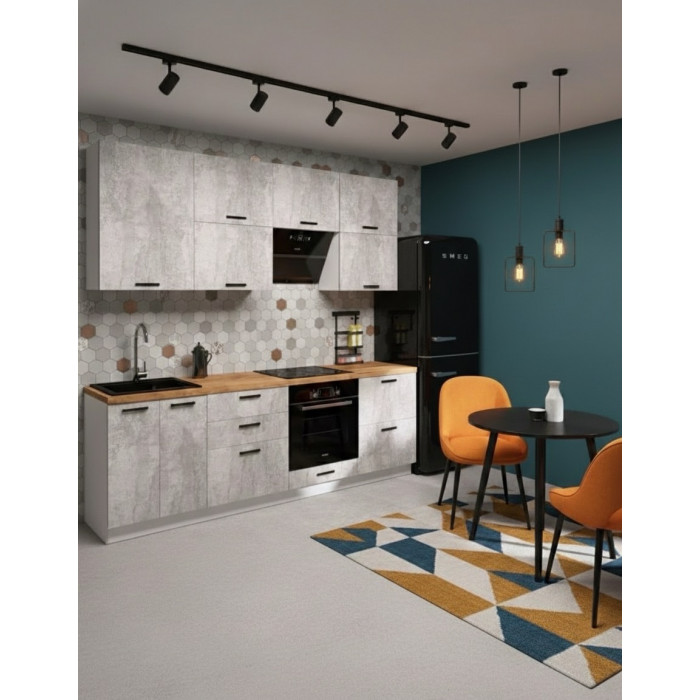 Современный дизайн кухни «Цемент- 1» легко впишется в любой интерьер. Вы можете выбрать один из базовых цветов, уже включённых в стоимость, или за небольшую доплату создать свою уникальную кухню, выбрав цвета из дополнительных категорий.