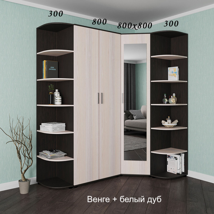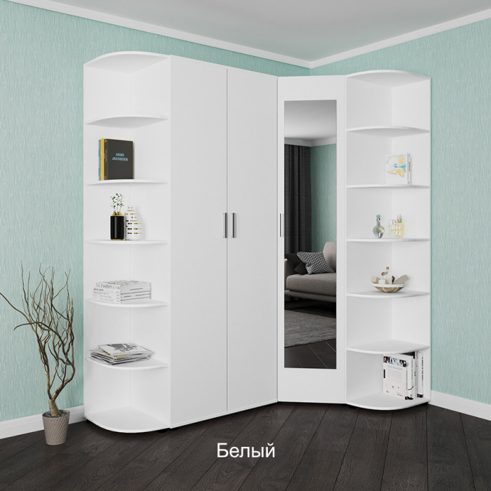 - Угловой распашной шкаф 800х800мм (слева штанга, справа 3 полки)
