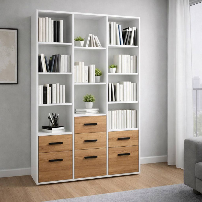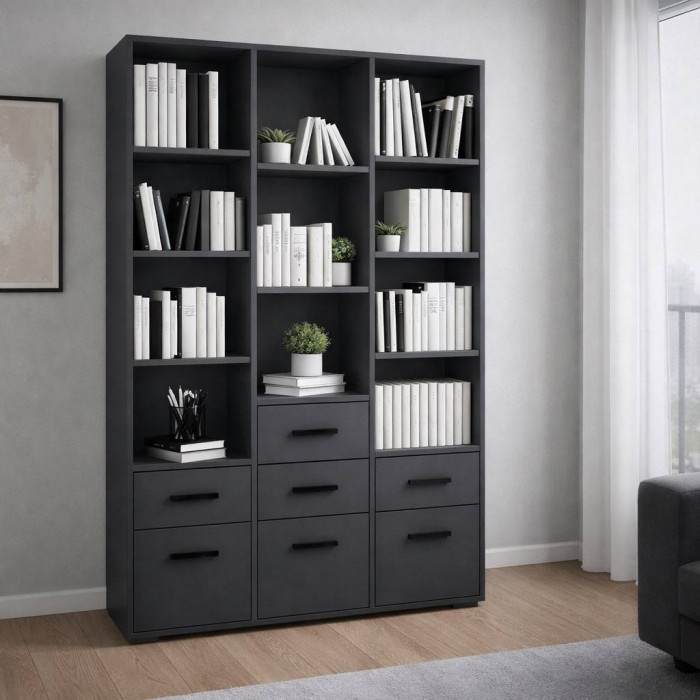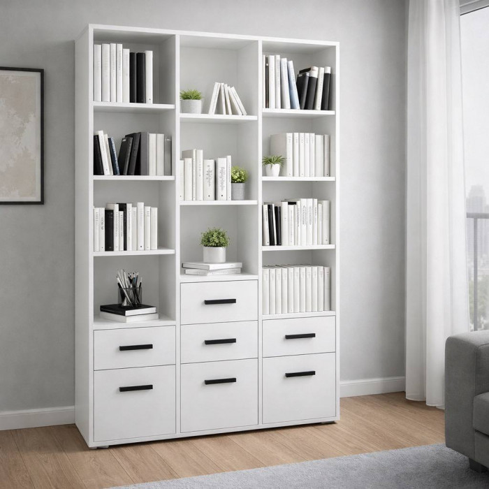 Стеллаж №26 украсит детскую или подростковую комнату и позволит поддерживать ее в порядке. Шкаф содержит множество открытых полок, способных вместить множество книг, игрушек и школьных принадлежностей. Четыре выдвижных ящика расположены на небольшой высоте от пола и доступны даже маленьким детям, которые могут складывать принадлежности для творчества. Закрытые полки снижу стеллажа идеально подойдут для хранения игрушек.
